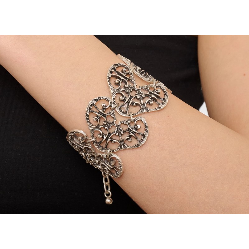 Bracciale in metallo linea etnica . Colore argento antico.Misura: circa 24mm x 24 cm di lunghezza, regolabileVenduti in confezioni da 1 pezzo.