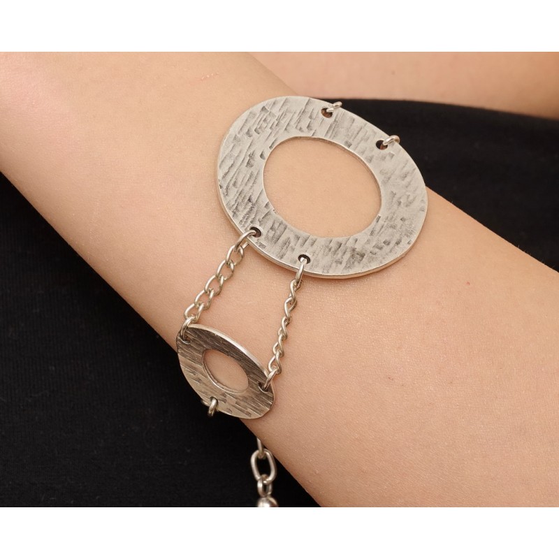 Bracciale in metallo linea etnica .Colore argento antico.Misura 35 mm larghezza, lunghezza regolabileVenduti in confezioni da 1 pezzo.