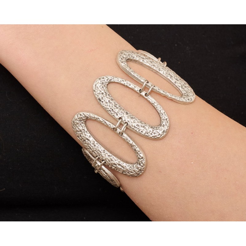 Bracciale in metallo zama linea etnica semirigidoColore argento antico.Misura: circa larghezza 23 mmConfezione da 1 pezzo.