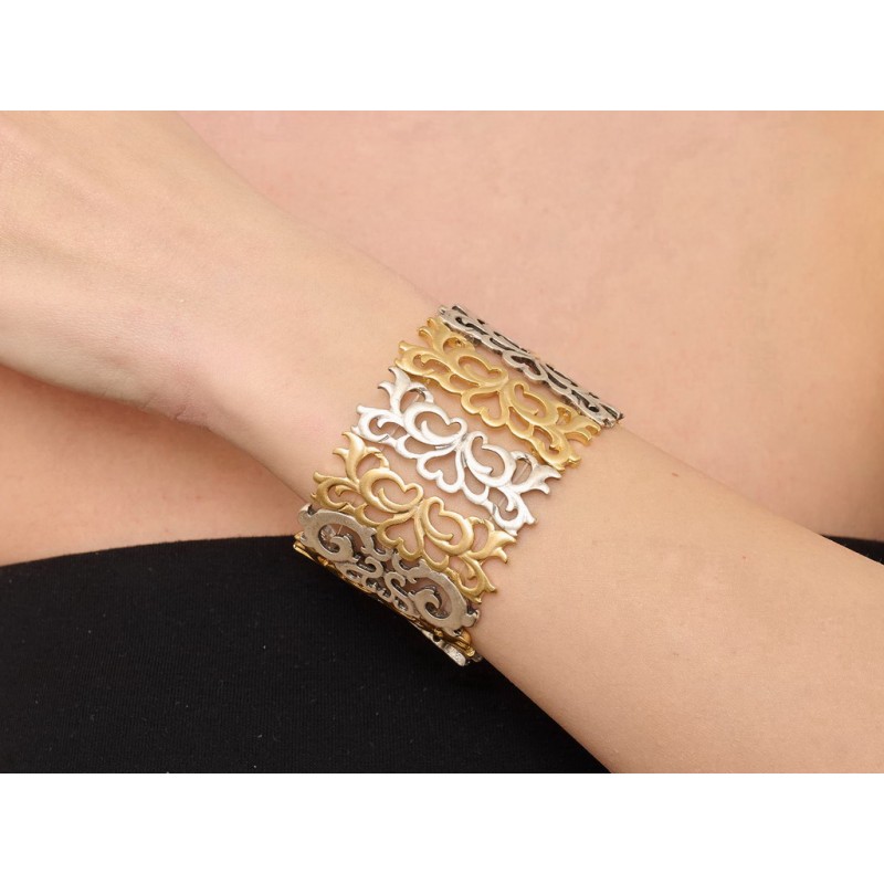 Bracciale in metallo zama .Colore silver satinato e oro satinato.Dimensione circa 35 mm di larghezza .Confezione da 1 pezzo.
