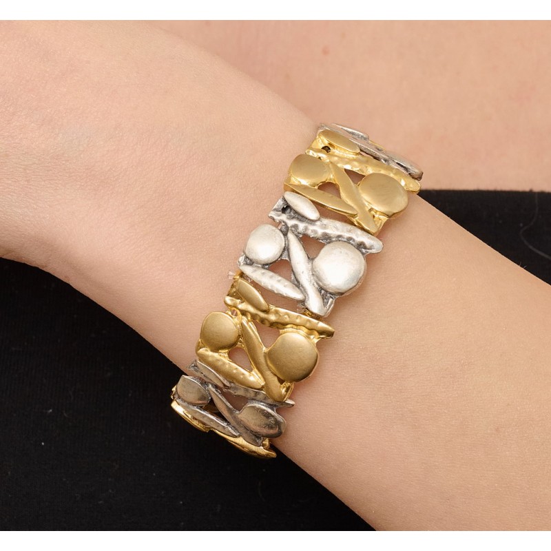 Bracciale in metallo zama elastico.Colore silver satinato e oro satinato.Dimensione circa 22 mm di larghezza .Confezione da 1 pezzo.