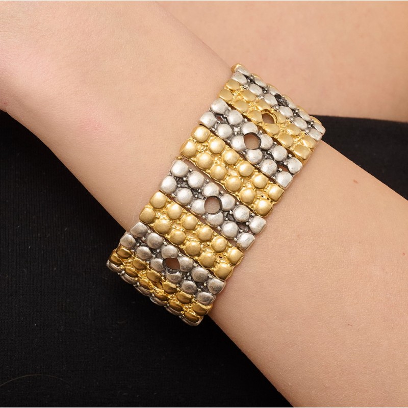 Bracciale in metallo zama .Colore silver satinato e oro satinato.Dimensione circa 34 mm di larghezza .Confezione da 1 pezzo.