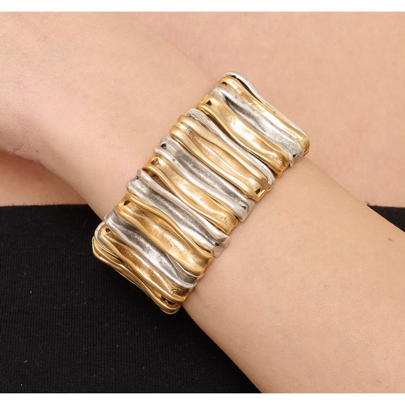 Bracciale in metallo zama elastico.Colore silver satinato e oro satinato.Dimensione circa 22 mm di larghezza .Confezione da 1 pezzo.