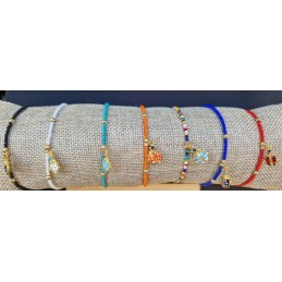 Bracciale perle miyuki e occhio di AllahDimensione centrale 4 mm,lunghezza 24 mm regolabile.Confezione da 12 pz assortiti .