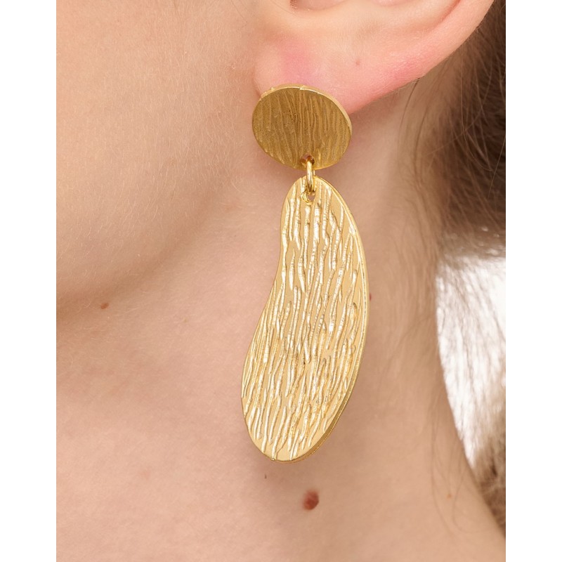 Orecchino in zama con decori etnici . Dimensione circa 70*25 mm. Color oro satinato Confezione da 2 pz.