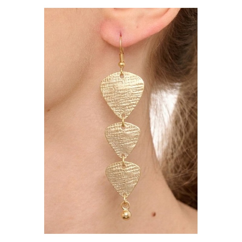 Orecchino in zama con decori etnici . Dimensione circa 43 mm. Color oro satinato Confezione da 1 pz.