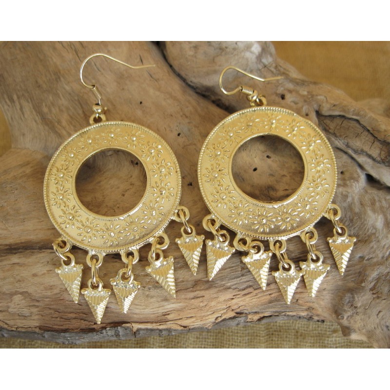 Orecchino in zama con decori etnici . Dimensione circa 34 mm. Color oro satinato Confezione da 2 pz.