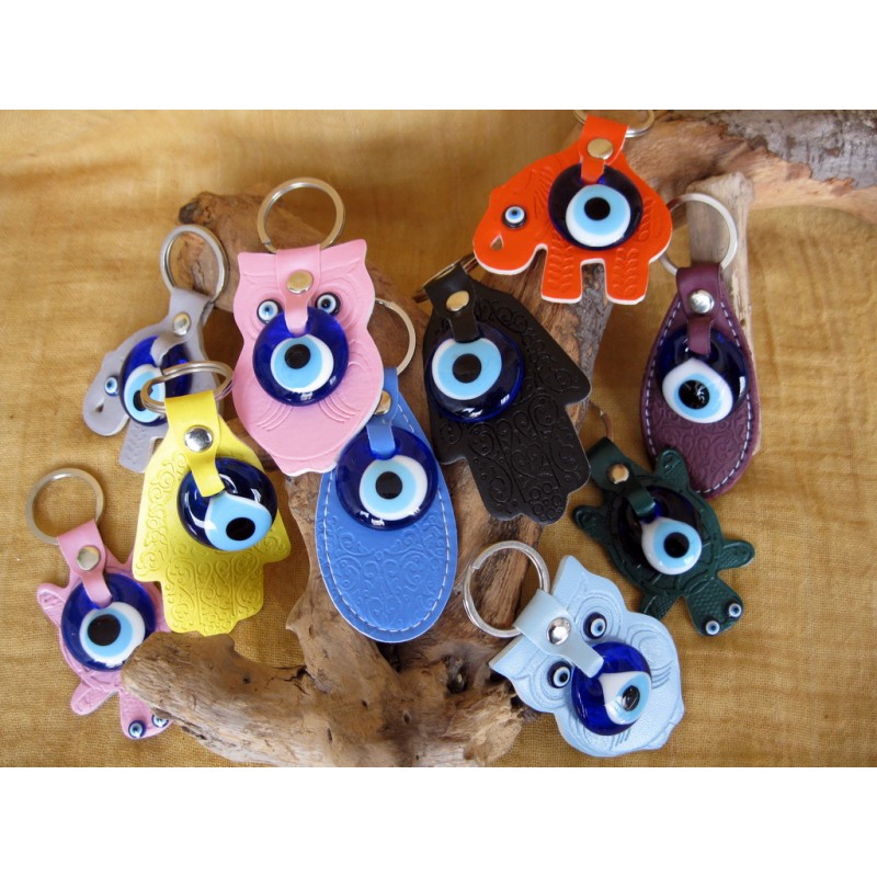 Portachiavi in zama con applicazioni in metallo e talismano occhio di Allah.Dimensioni assortite 8/15 cm.Confezione da 24 pz assortiti .